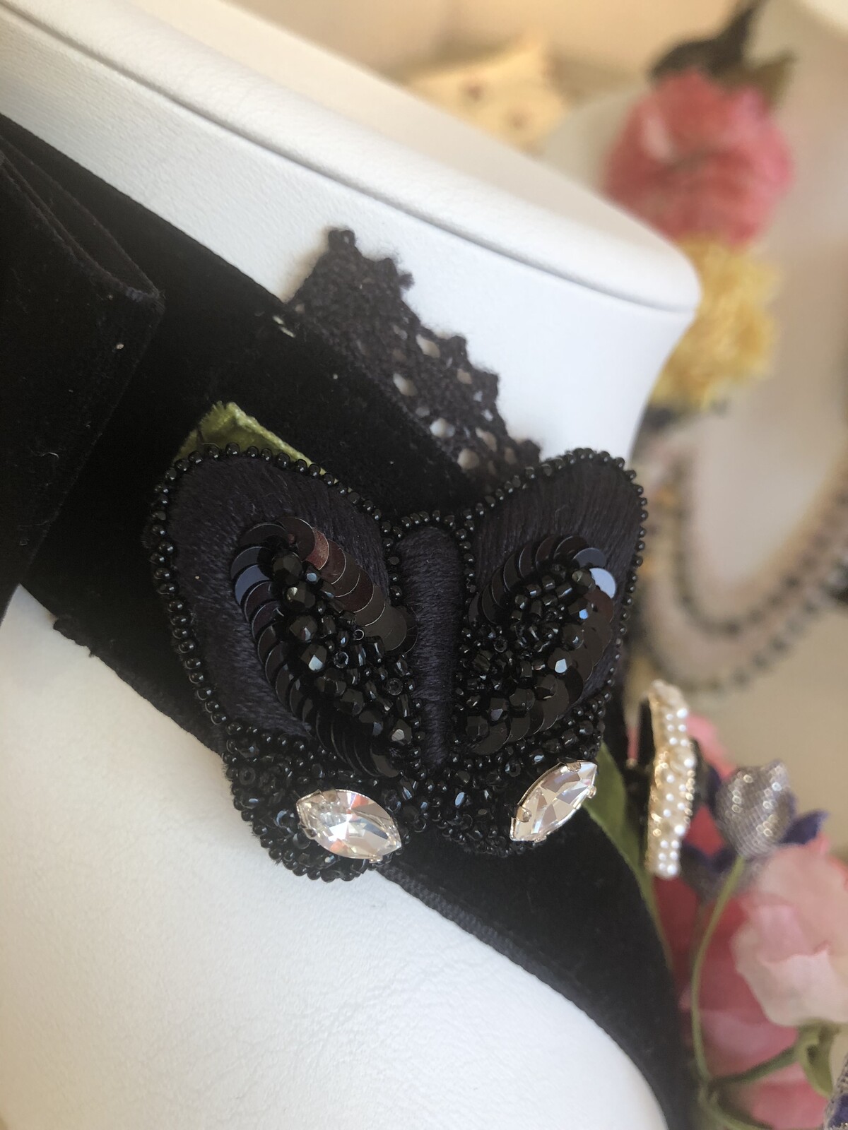 В одном жуке (тот, что на шее) добавила еще немного зеленого переливающегося бисера, расшила страз по кружеву и т.к. страз круглый еще заполнила остаток до головы, получается под крылышками., немного зеленого на голове и парочку на крылышках. В жизни жуки и бабочка супер))).