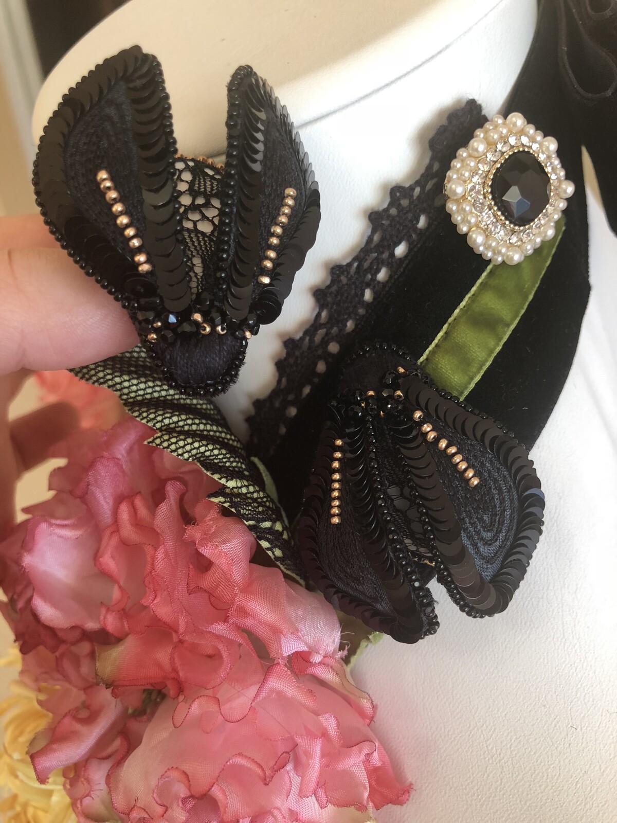 - Стрекоза: чёрной сетки не было в магазине, вышивала на кружеве. Паетки честно пришила люневильским крючком( фото прилагается) но когда всё соединила и обвязала камень, поняла, что ошиблась с размером паеток, пришлось распустить и пришить уже в ручную.
