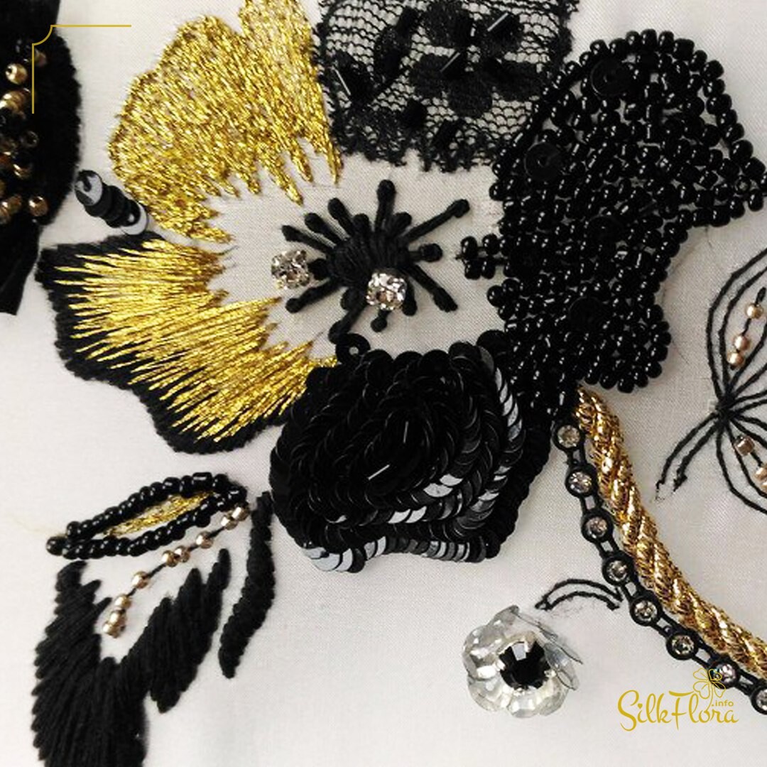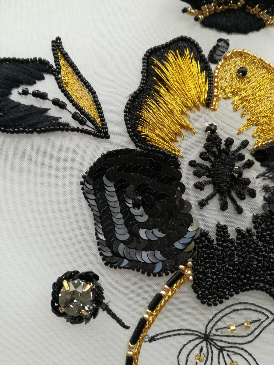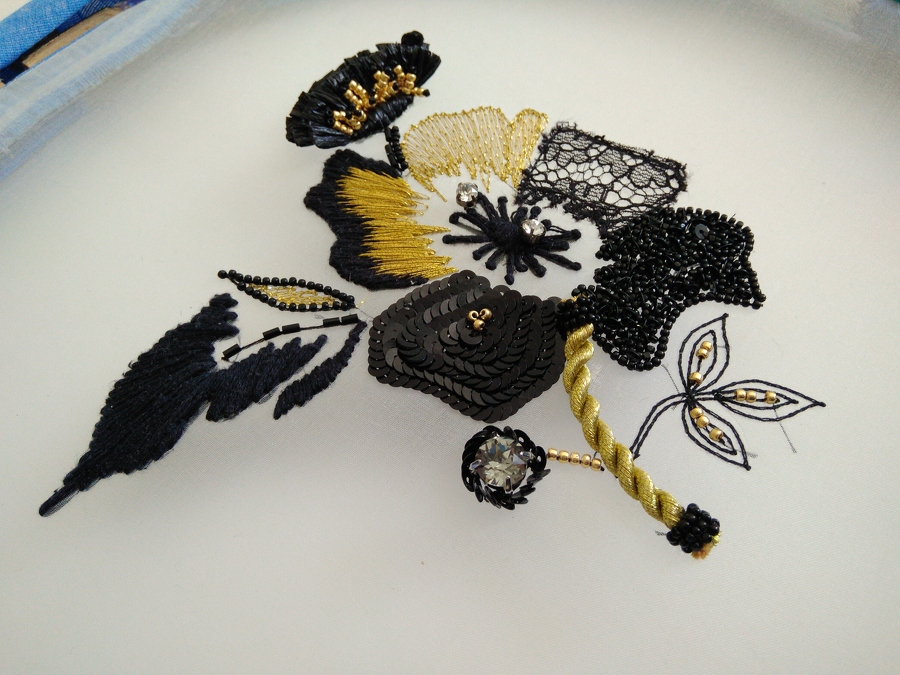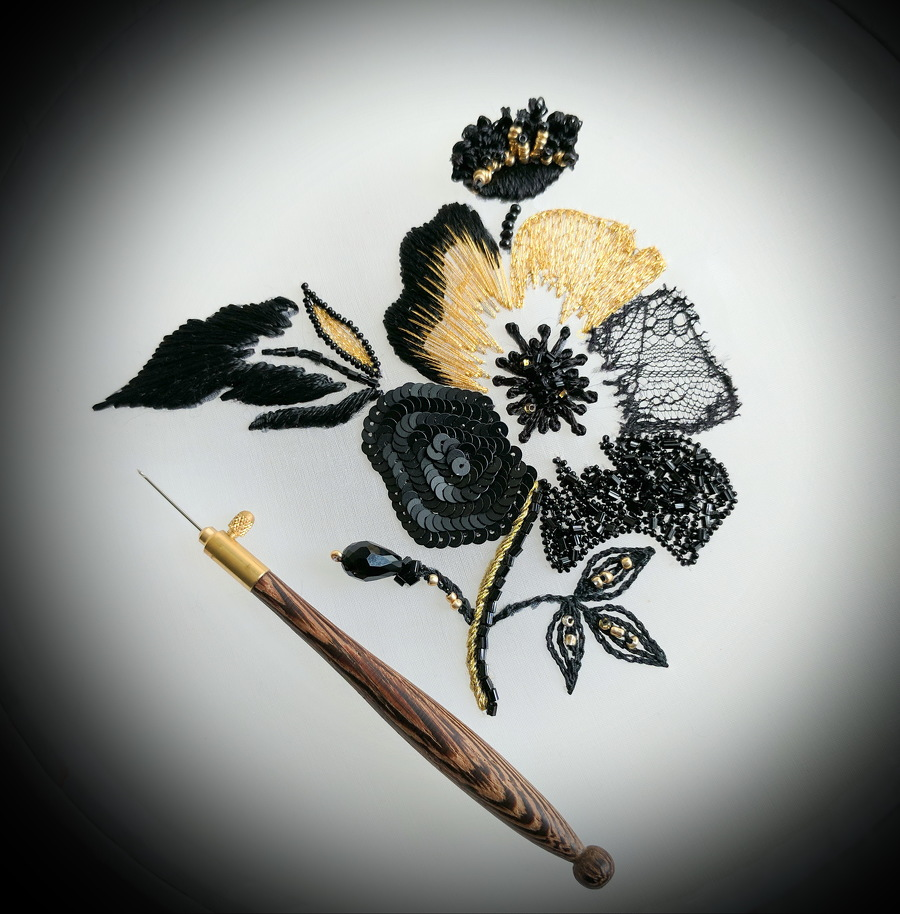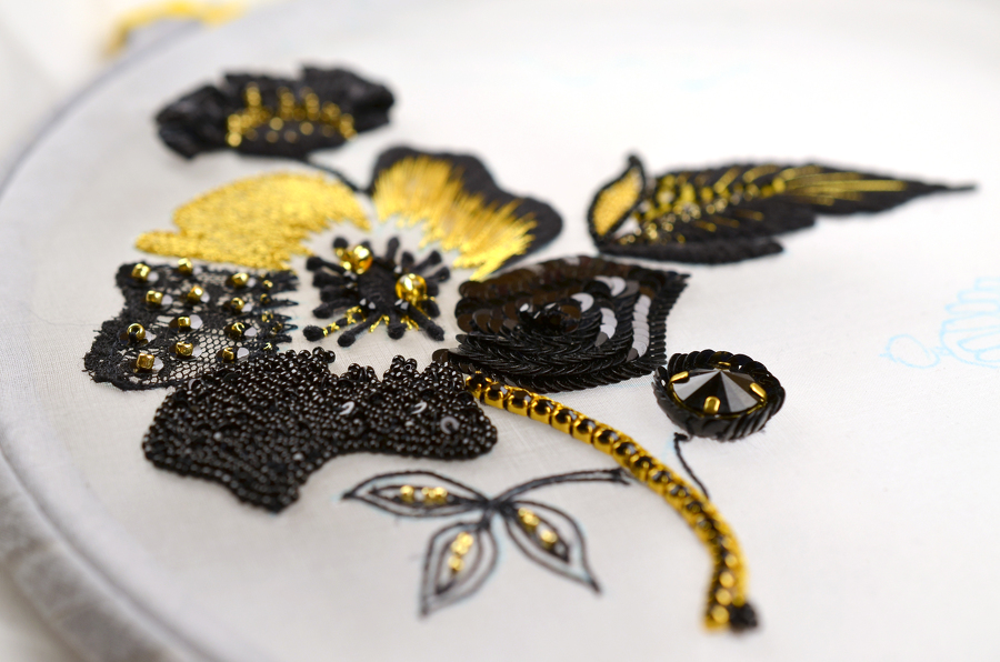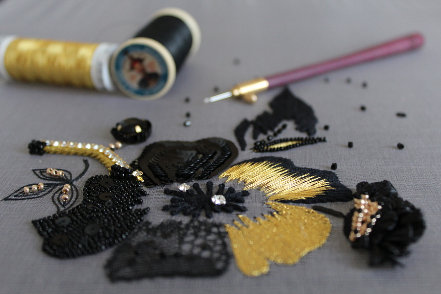 - выполните 5 лепестков в разных стилях: вышивка золотой лентой и пайетками, аппликация, заполнение змейкой и мелким бисером (это позволит вам рассыпать камни в красивом салюте) и гладь — фирменный стиль дома-вышивки Лесаж