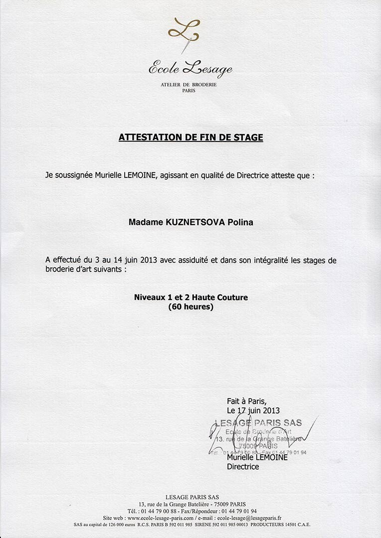 - Обучалась в школах кутюрной вышивки Лесаж в Париже